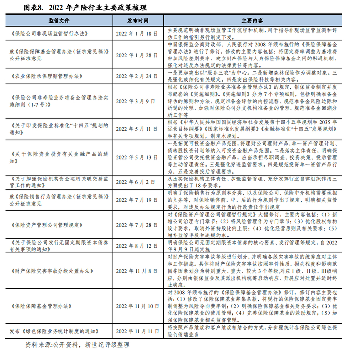(三)2022年,银保监会针对保险行业承保端、投资端、资本补充等方面出台多项政策,在补齐监管短板、保护消费者合法权益、强化保险保障功能的同时,促进行业持续健康发展。