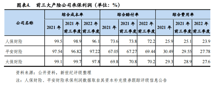 从前三大产险公司来看,2022年前三季度,人保财险、平安财险和太保财险综合成本率分别为96.1%、97.22%和97.8%,同比分别下降2.8个百分点、上升0.4个百分点和下降1.9个百分点。具体来看,人保财险综合成本率同比下降主要得益于车险、意外伤害及健康险、农险等综合成本率的压降,此外,信用保证险综合成本率同比亦显著下降;平安财险车险业务综合成本率同比下降,但受新冠疫情多点散发对小微企业生产经营造成冲击影响,平安财险保证险业务综合赔付率明显上升,同时意外伤害险等险种赔付率也有所上升,导致其综合成本率同比上升;太保财险综合成本率下降主要得益于车险、健康险、农险等险种综合成本率的下降。