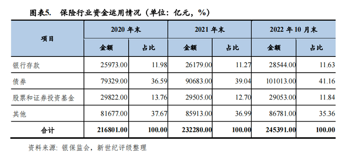 资金运用方面,银保监会数据显示,截至2022年10月末,我国保险行业资金运用余额24.54万亿元,较年初增长5.64%,其中银行存款2.85万亿元,占比11.63%,较年初上升0.36个百分点;债券10.10万亿元,占比41.16%,较年初上升2.12个百分点;股票和证券投资基金2.91万亿元,占比11.84%,较年初下降0.86个百分点;其他投资8.68万亿元,占比35.36%,较年初下降1.63个百分点。