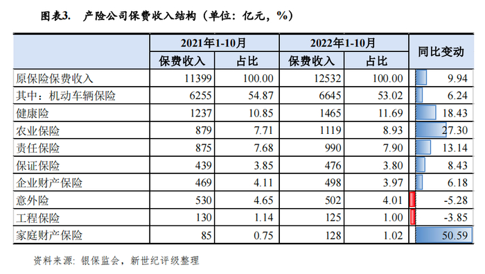 2. 在车险保费增速回升的同时,健康险、农业险、责任险等非车险种保费收入增速依然高于车险,在产险公司保费收入中占比继续提升,仍为产险公司保费收入增长的重要支撑。