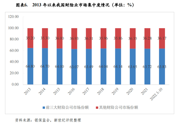 从市场集中度来看,2022年1-10月,财产保险行业原保险保费收入排名前三位的公司市场份额合计为63.83%,较2021年上升0.11个百分点。从变化趋势来看,近10年以来,前三大产险公司市场份额下降幅度仅为1个百分点左右,行业集中度长期维持稳定。