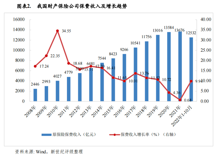 2022年,得益于购置税减半等政策持续发力、加之新能源汽车高速增长拉动,我国汽车产销量自6月以来迅速回升,当年1-10月累计产销量同比分别增长7.9%和4.6%,叠加上年同期低基数的保费收入,当期产险公司实现原保险保费收入12532亿元,同比增长9.94%,增速较上年同期提高10.87个百分点。中长期来看,车险的“消费品”属性为产险行业提供了可持续发展的基础,国内大规模的汽车保有量仍是车险保费收入的稳定支撑;同时,健康险、责任保险、农业险以及特殊风险保险等非车险种较快发展,叠加汽车行业向新能源汽车转型的拉动,行业整体仍具有一定发展潜力。