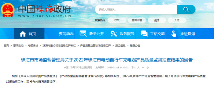 中国质量新闻网讯 近日,珠海市市场监督管理局发布关于2022年珠海市电动自行车充电器产品质量监督抽查结果的通告。