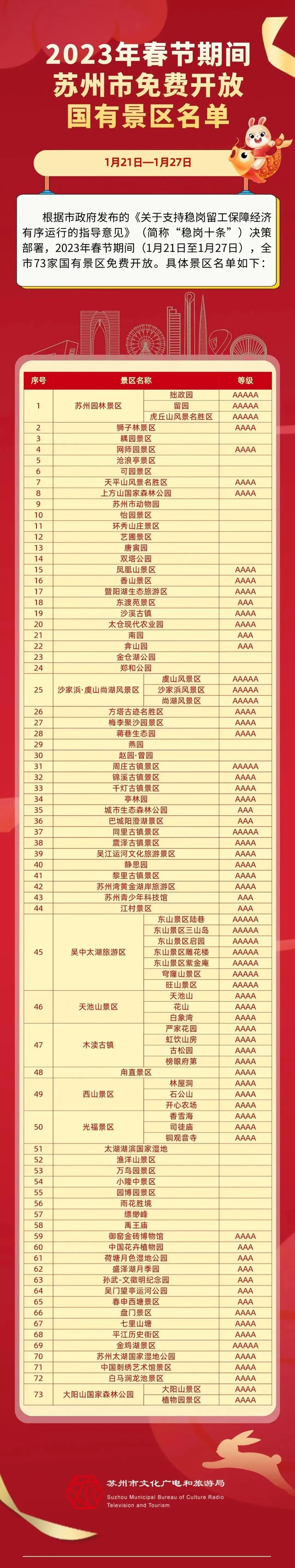 春节假日,拙政园、虎丘山风景名胜区、周庄古镇、同里古镇等73家国有景区景点免费对外开放。同步推介“畅游园林”“悠游古镇”“乐游山水”“趣游人文”主题景区游线,让市民游客邂逅写意江南风雅、体验水乡年味生活、享受自在田园诗意、亲近自然寓教于乐。