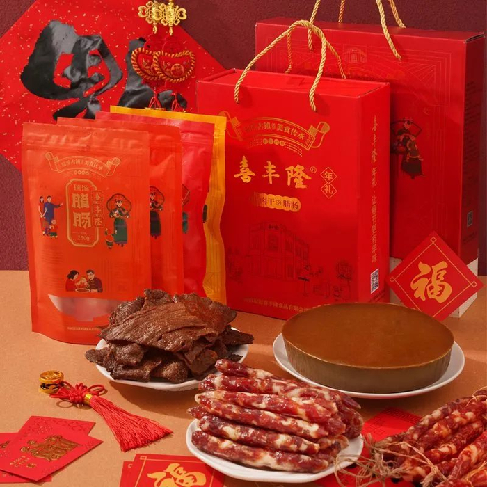 具备百年历史传承中式老手艺,纯手工打造。软糯的红糖年糕,肥美流油的腊肠,肉脆香甜的牛肉干,各有各的寓意。这年货,带回家的不仅是美食,更是美意。