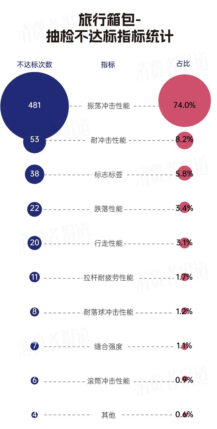 抽检发现,582批次旅行箱包不达标,但不达标项目集中在振荡冲击性能、耐冲击性能、标志标签、跌落性能、行走性能、拉杆耐疲劳性能等几个项目上。