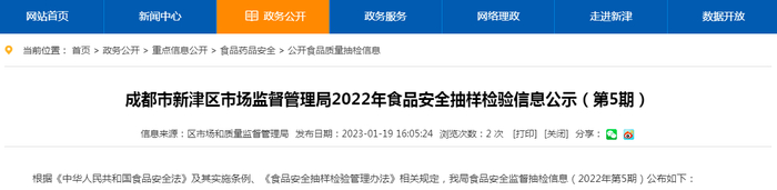 中国质量新闻网讯 2023年1月19日,成都市新津区人民政府网站发布新津区市场监督管理局2022年食品安全抽样检验信息公示(第5期)。