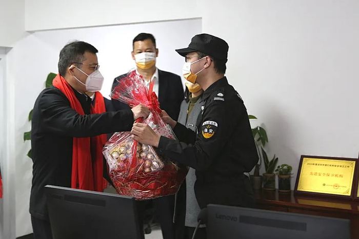 在分行放款中心,当听到同事们为保障业务开展,在疫情期间成立突击队驻扎公司办公时,全华强总会计师对大家的辛勤付出表示感谢。在监控中心,他详细听取了分行安保系统的运作和管理情况,叮嘱大家一定要重视安全生产,过一个平安年。