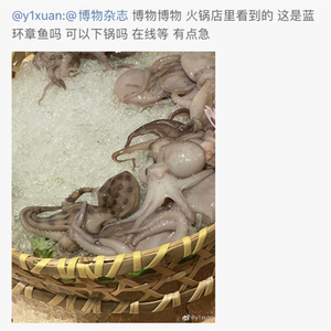 饭前先拍照,或许能救命。近日,一网友在火锅店就餐时拍下一外表特殊的章鱼,询问科普博主能否下锅,没想到图中的章鱼竟然是全球十大最毒动物之一的剧毒生物——蓝环章鱼!