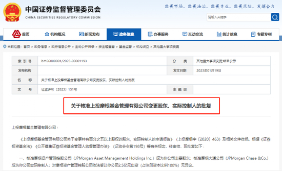1月19日,中国证监会官网显示,核准摩根资产管理控股公司(以下简称“摩根资管”)成为上投摩根基金管理有限公司主要股东;核准摩根大通公司成为上投摩根基金实际控制人;对摩根资产管理控股公司依法受让上投摩根基金2.5亿元出资无异议。