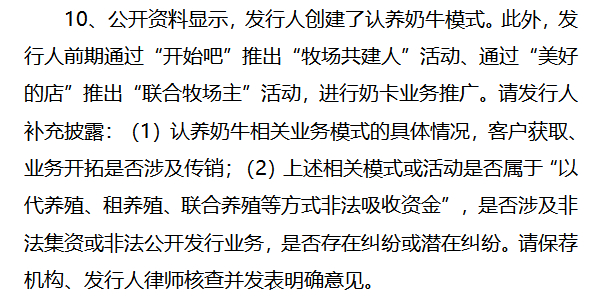 问题之多,包含奶源、商业模式、信息披露等方方面面,相当于委婉地表达了对这份招股书的不满。其中,有关于是否涉及传销的问题,最是引人侧目。面对证监会几乎定性式的发难,认养一头牛本就毁誉参半的风评,又多蒙上了一层阴影。