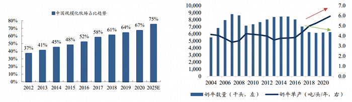 然而,未来市场奶价变化的主逻辑仍然是上涨。近十年来,国内市场奶牛单产上升,奶牛总数下降,规模化牧场占比持续上升,呈现出用更少奶牛生产更多奶的趋势。这持续颠覆着中小乳企、养殖户原本混杂粗放、奶源质量不稳定、抗风险能力低的生产方式。毕竟,集约化、计划生产的方式才能够有效保障奶源的质量并形成规模效益。