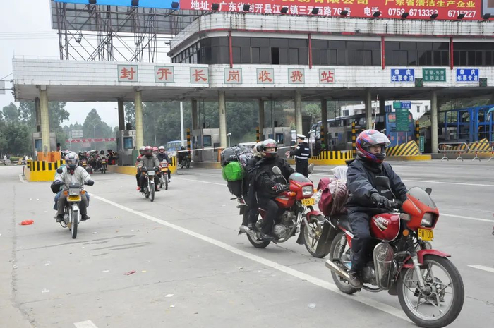 2010年2月3日,返乡过年的广西农民工骑摩托车进入广东封开县长岗收费站。封开县是321国道从广东进入广西的第一站,是广西籍农民工驾摩托车返乡的必经之路。据初步估计,2010年年春运期间,通过该县返乡和返回珠三角的摩托车超过13万辆。(新华社发/韦石明摄)