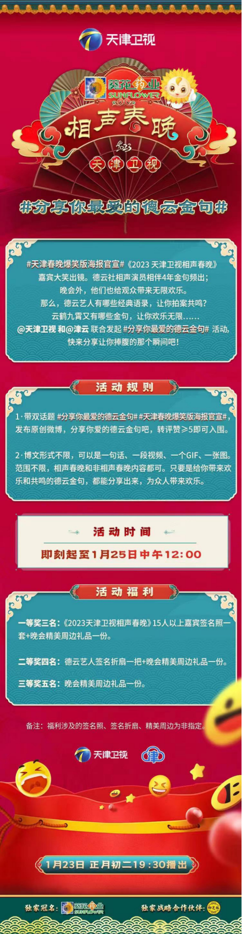每年相声春晚都金句频出,今年的晚会依旧有很多兼具笑点与热点的金句出现,引发观众们对青春、对网络事件、对社会现象等多方面的共鸣。比如:岳云鹏的“我可不好哄”,孟鹤堂的“我被支配了”,张九龄的“青春就像王九龙的包袱,充满了尴尬”……此次,@天津卫视 联合 @津云 发起#分享你最爱的德云金句#活动,上微博搜索话题参与活动,就有机会获得晚会演员签名照、折扇或精美周边葵花药业礼品一份。