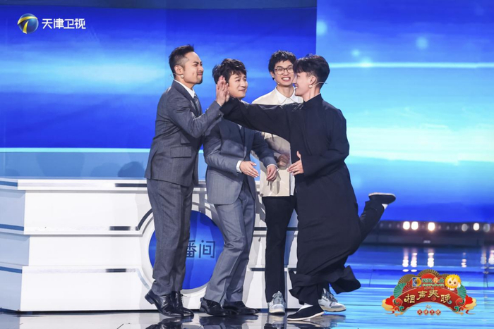 晚会节目为了在设计上更加多元融合,还邀请了歌手梁龙、喜剧演员宋木子、合文俊、李飞和脱口秀演员毛豆惊喜加盟,为观众们奉上一场被大笑包围的喜剧盛宴。提到跨界,不得不说张鹤伦与梁龙带来的跨界相声,当相声遇上摇滚,两位演员碰撞出的火花妙不可言。