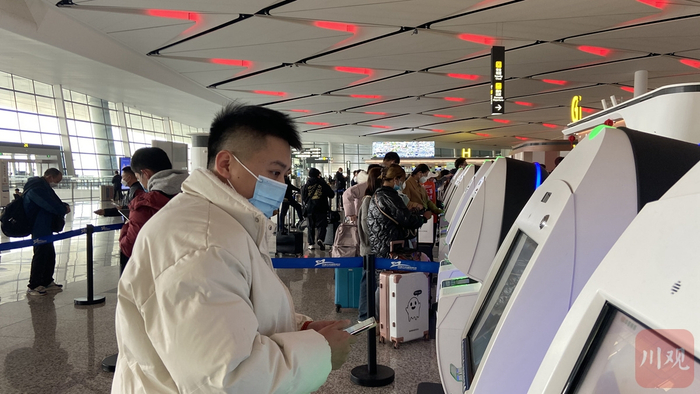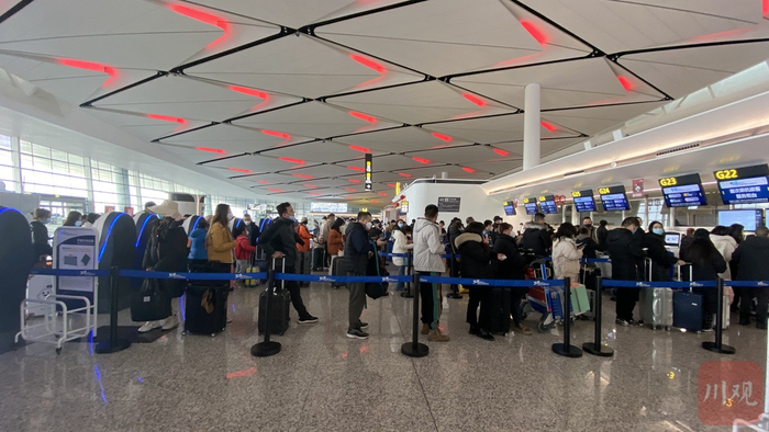 春节出境的旅客也不少。1月18日中午,成都双流国际机场T1航站楼出发大厅,出境办理区人来人往,安检处排起了长队。当天,多趟前往曼谷、圣彼得堡、金边等地的航班整装待飞。