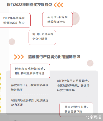 柜员吴倩(化名)对年终奖已经不抱有太大的希望,她告诉北京商报记者,“2022年疫情在家办公了几个月,网点业绩整体受到影响,今年到手年终奖预计会少1万元”。