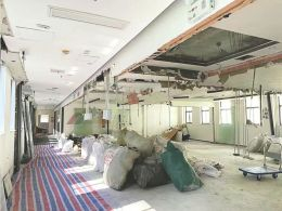 朱瑞晓提供的现场图片和视频显示,在这之后,德必经典将9楼的公共区域拆除并断电,张贴海报(2021年9月3日贴出公区改造函,9月9号开始装修),走廊上随意堆放建筑垃圾,现场还遗留裸露的电线和未拔除的长钉。