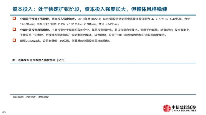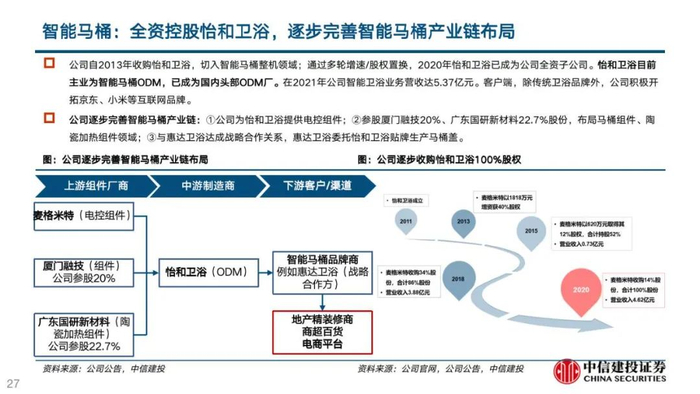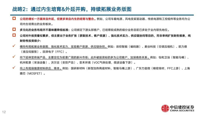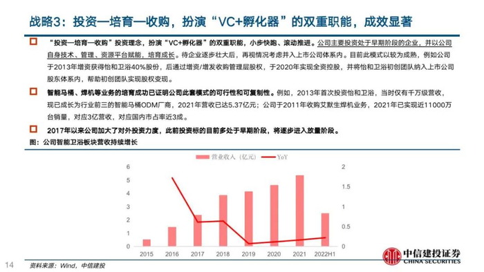 业务端,内生培育&外延并购并举,“投资—培育—收购”的孵化模式,背后是高效的管理、整合能力。这套独特的、可复制的模式是支撑公司持续增长的基石,智能卫浴、智能焊机等业务的成功已充分证明了其可行性。