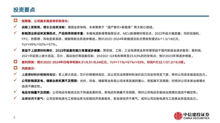 新能源业务迎来发展拐点,产品矩阵持续丰富:车载电源新增零跑等定点,MCU新增哪吒等定点,2022年起大幅放量;同时压缩机、FFC、热管理、风电变桨系统、储能等新业务逐步推进。预计2022-2024年新能源及轨交营收有望达6/11.5/18亿元,YoY+99%/+92%/+57%。