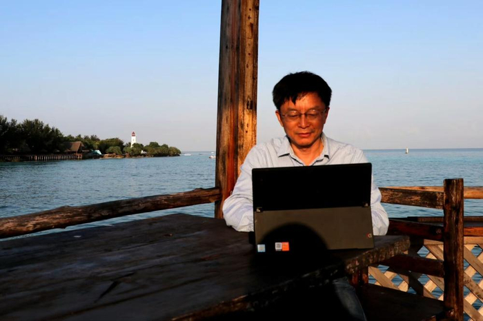张进在湖边处理工作。 受访者供图