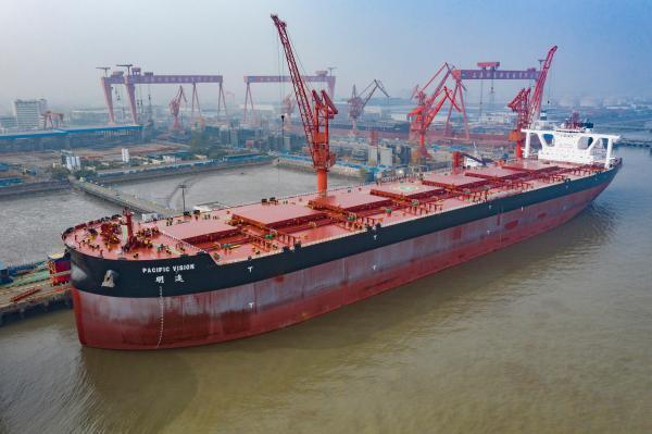 2018年11月28日,由上海外高桥造船有限公司为招商局能源运输股份有限公司量身订造的全球首艘40万吨智能超大型矿砂船(VLOC)“明远”号在上海命名交付。 本报记者 赖鑫琳 摄。