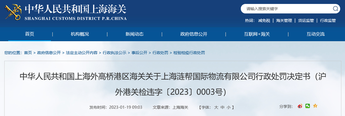 中国质量新闻网讯 2023年1月19日,上海海关网站发布上海外高桥港区海关关于上海涟帮国际物流有限公司行政处罚决定书(沪外港关检违字〔2023〕0003号)。