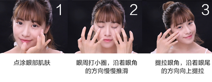 涂眼霜时都很注重手法。先取一点眼霜,用点涂的手法,把眼霜均匀地涂在眼周,一抹,特别滋润。