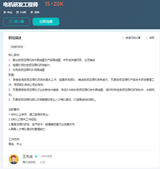 据业内人士透露向记者,此事业内早有风闻,而且海尔2022年已在中山设立压缩机研发中心。招聘网站显示,海尔也确有相关招聘动作。