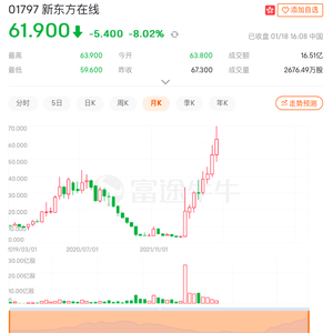 股价也一路波动上涨,直到2022年12月28日迎来58.25港元。直播一年,股价上涨超700%,这便是对新东方在线转型的最好认可。