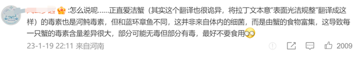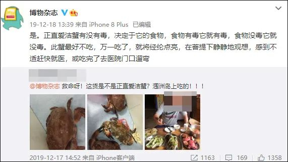“正直爱洁蟹有没有毒,决定于它的食物,食物有毒它就有毒,食物没毒它就没毒。此蟹最好不吃,万一吃了,感到不适赶快就医,或吃完了去医院门口遛弯。”