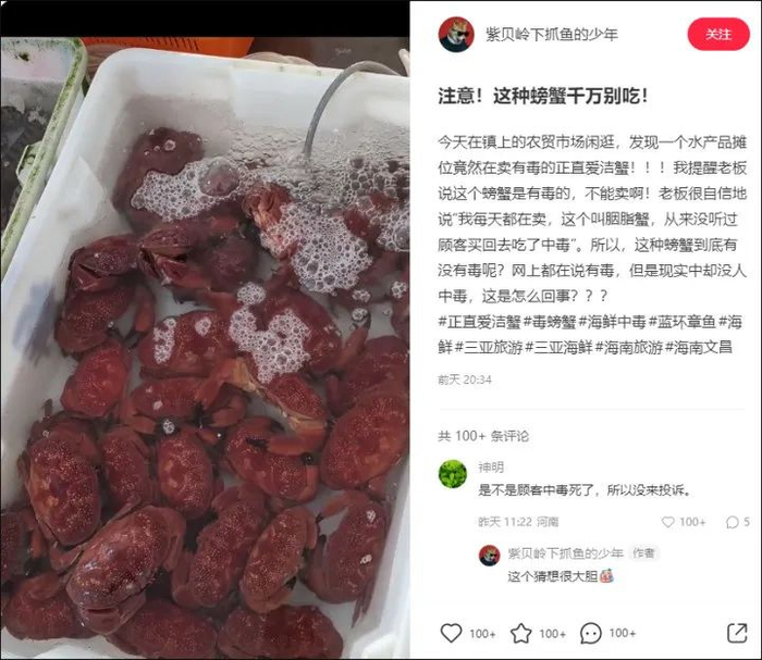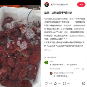 网友提醒老板说这个螃蟹是有毒的,不能卖,“老板很自信地说:'我每天都在卖,这个叫胭脂蟹,从来没听过顾客买回去吃了中毒。'”
