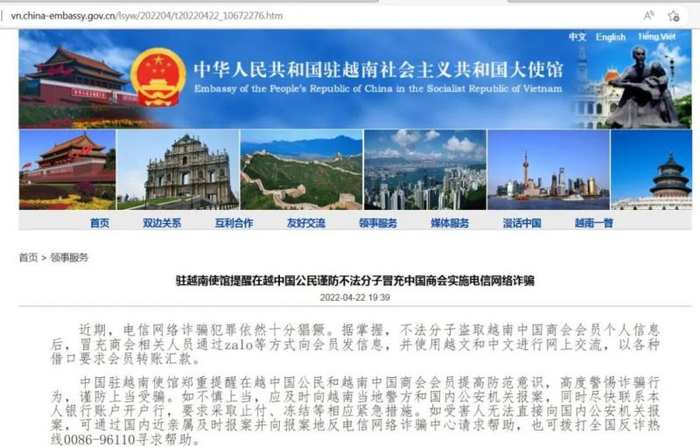 有人甚至干脆冒充使馆人员实施诈骗。2021年10月、2022年1月,中国驻越南大使馆就两次提醒道:中国驻越使领馆不会向您索要银行账户、密码等重要信息和提出转账、汇款等要求,请在越中国公民务必提高防范意识,警惕不法分子冒充使领馆工作人员进行电信诈骗。