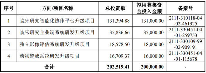 根据招股说明书,(1)发行人拟募集资金200,000.00万元,用于投资临床研究智能化协作平台升级项目、临床研究企业端系统研发升级项目、独立影像评估系统研发升级项目、药物警戒系统研发升级项目;(2)发行人拟通过购置房产的方式获取上述募投项目所需办公场所,将通过公开市场价格购买不超过26,000平方米的办公楼,投资预算70,308.00万元;(3)相关募投项目硬件设备投资和人员投入金额较高,软件投资较低。