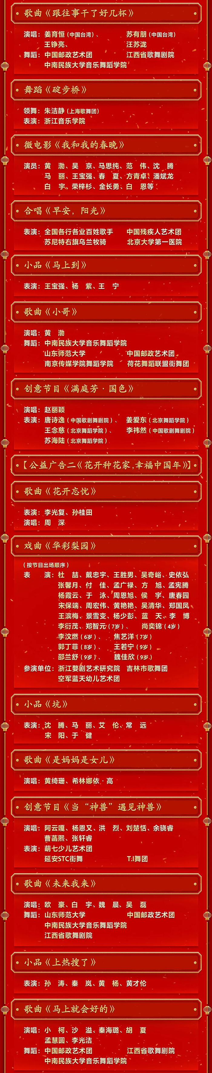 节目单中,歌舞类节目令人眼前一亮,既有质朴真情的舒心曲,也有清新雅致的“田园诗”。《远征》《未来我来》《青春向太阳》等歌曲高亢悠扬,给人以力量。《一带繁花一路歌》以国际化的元素,展现文明交流互鉴带给各国人民的喜悦与欢欣。《开饭!开FUN!》《好运全都来》《新春蹦蹦》年味十足,朗朗上口。《你好,陌生人》《早安,阳光》《小哥》暖心励志,传递社会的一股股温情暖流。《绿水青山》《家园》《我的家乡》清新隽永,用歌声礼赞大美中国。