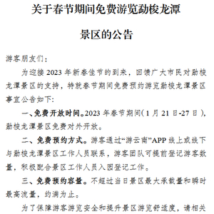 为丰富广大市民游客春节期间文娱活动,展示景东县生态文明建设成果,经研究,景东亚热带植物园春节期间部分景点将对广大市民游客免费开放,开放时间为2023年1月20日—1月27日。
