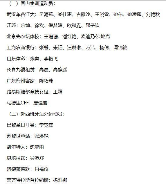 中国女足的这份34人名单包括吴海燕、娄佳惠、古雅沙、王晓雪、姚伟、姚凌薇、刘艳秋7名来自上赛季女超冠军武汉女足的球员;金坤、徐欢、倪梦婕、欧懿垚、邵子钦5名来自上赛季女超亚军江苏女足的球员;王珊珊、潘红艳、麦迪乃·沙地克3名来自上赛季女超季军北京女足的球员;张馨、朱钰、汪琳琳、方洁、杨倩、闫锦锦6名来自上赛季女超第四名上海女足的球员;张睿、李艳飞两名来自上赛季女超第五名山东女足的球员;高晨、高静遥两名来自上赛季女超联赛第六名长春女足的球员,以及来自上赛季女超联赛第七名梅州女足的陈巧珠。
