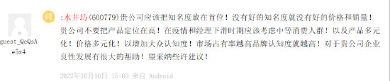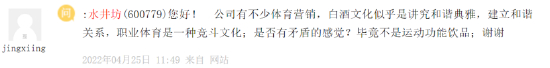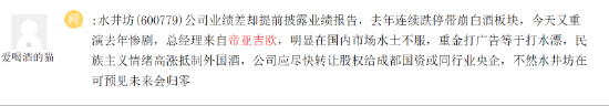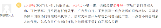 水井坊的高端布局不少投资者并不买账,有投资者认为公司应该考虑中等消费人群,把知名度放在首位;也有投资者认为白酒不是运动功能饮品,职业体育与白酒文化有矛盾之处;还有投资者认为广告没有任何效果,赞助的节目不符合喝酒人的气质等等。