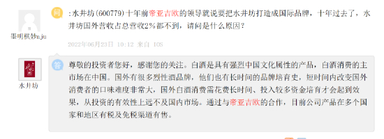 2010年,由帝亚吉欧提名的英国人柯明思成为水井坊的第一位“洋掌门”,柯明思上任后表示,“希望在5年内令水井坊国际市场的销售占比上升至40%”。十余年过去了,据水井坊2022年三季报,产品在国外销售的占比仅有1.38%,当时提出的40%占比早已成为笑谈。