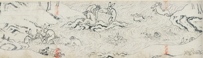 在日本绘画中最为著名与兔有关的作品是《鸟兽人物戏画》,被认为是日本漫画的开山之作。《鸟兽戏画·甲卷》描绘了各式各样的动物进行相扑、射箭、玩水、喧哗及法事的场景。其中甲卷表现的是一个日本民间故事,主角是兔子和青蛙,配角是猴子和狐狸,因为年代久远,故事已经失传,但画面中兔子、青蛙会骑驴会射箭、还会捏着鼻子跳水,几乎模拟人的样子。