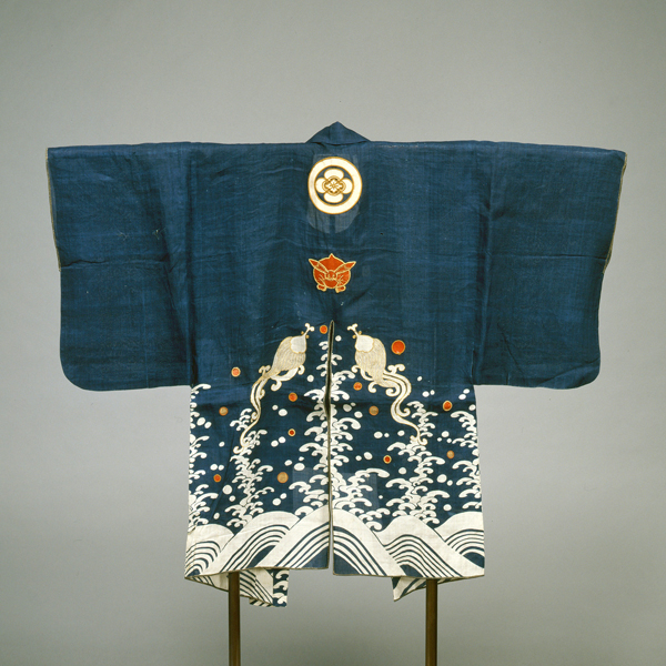 兔雨龙纹样藏青麻衣,江户时代·19世纪,东京国立博物馆藏,这是一种武家女性用的消防装束,设计了海浪中的兔子、雨龙等祈雨的图案。