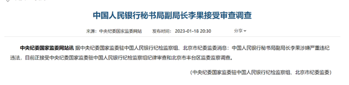 今年1月18日,中国人民银行秘书局副局长李果因涉嫌严重违纪违法被查,李果是范一飞在央行的首任秘书。李果2008年前后考入中国人民银行总行,曾供职于支付结算司,后长期在央行秘书处工作,2015年2月,范一飞担任央行副行长后,成为范一飞的秘书。