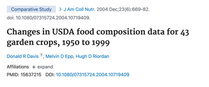 2004年12月发表在《美国营养学会杂志》(Journal of the American College of Nutrition)一篇和果蔬营养学的文章,科学家利用美国农业部1950年和1999年发布的营养数据,德克萨斯州大学奥斯汀分校的研究人员注意到43种不同的果蔬,比如芦笋、菜豆到草莓和西瓜,它们的13种营养成分发生了变化。