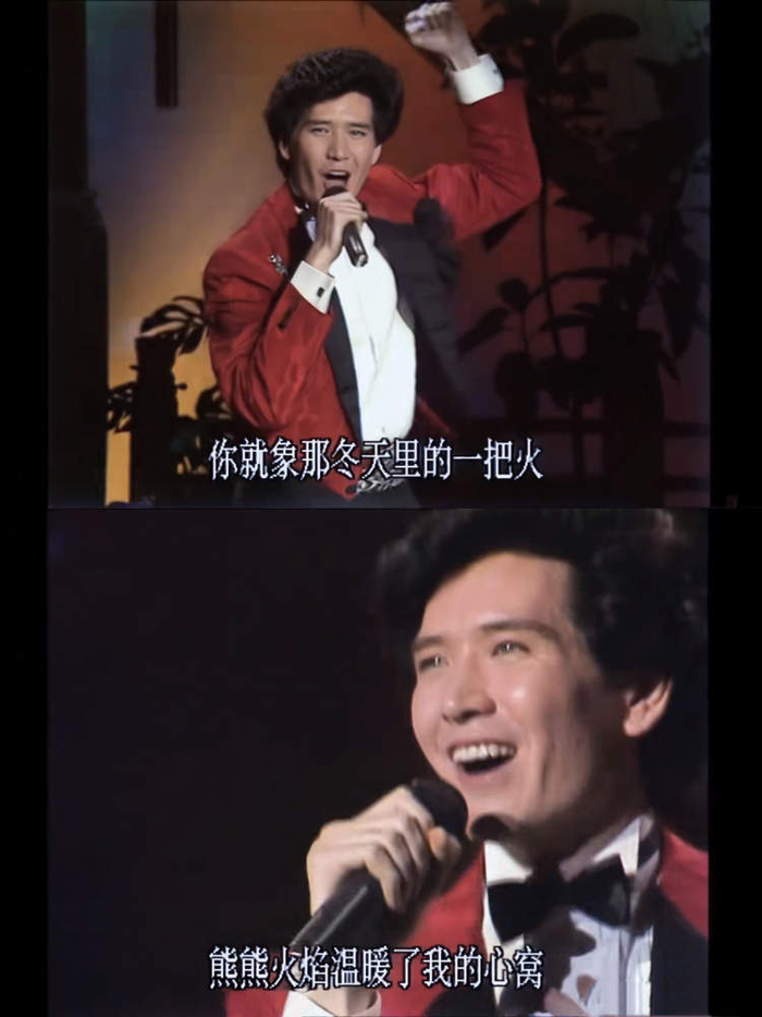 A 费翔:这个“爆炸头”是烫的,当时挺时髦的…...哈哈。真的是毁了一代男士的发质。服装是在台北定制的,颜色是特地为了春晚选的(其实平常我从来都不穿红色)。