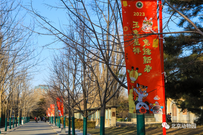 大红灯笼高高挂,五星红旗迎风展,北京动物园穿上了新春喜庆装扮,迎春纳福氛围浓浓。