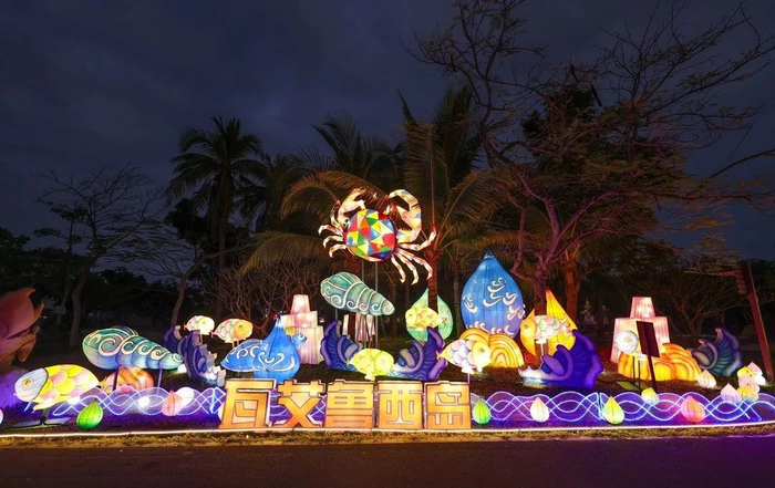 惟妙惟肖的兔子、绚丽多彩的花灯、韵味十足的灯笼长廊……西岛首届海洋文化艺术灯会以红色文化、西岛渔村文化、海洋文化,设置超过20000个灯源近40个大型艺术造型灯组融合生态环保、文化和合共生等理念进行设计。