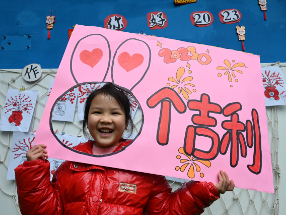 2022年12月30日,四川省内江市东兴区蓝天幼儿园的小朋友们在参加“你好,2023”趣味活动,迎接新年的到来。小朋友们兴奋地化身为“兔”个吉利。通讯员 兰自涛 摄