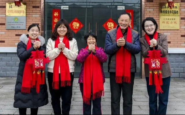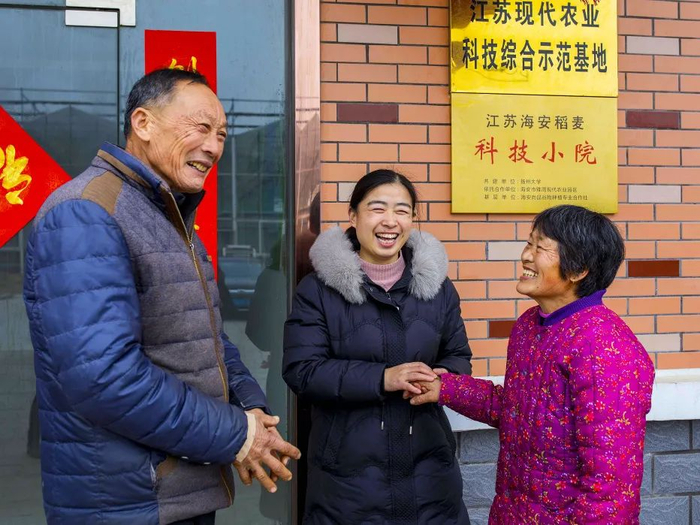 2023年1月15日,海安稻麦科技小院负责人、扬州大学农学院副院长魏海燕(下图 中)带领团队查看完种植户韩瑜梅家的麦田后,来到科技小院张贴春联。“科技小院建在高标准农田边,长期有专家、研究生走到我们身边,组织培训、指导生产,稻麦产量越来越高。”种植户韩瑜梅一边说一边贴春联。通讯员 王一凡 耿金鹏 摄