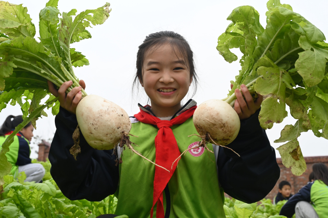 2022年12月8日,四川省内江市东兴区椑木镇中山学校,学生们在校园“开心农场”内采收萝卜。孩子们结合农时走进农场种植蔬菜瓜果,这是他们的校内成长乐园。兰自涛 摄