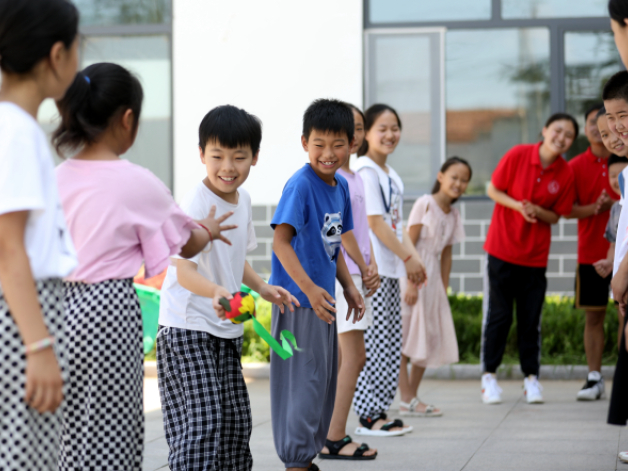 2022年暑假期间,山东理工大学社会实践团16名大学生志愿者来到沂蒙山区沂南县依汶镇青杨行村,开展为期15天的暑期公益支教活动,陪伴山村30多名留守儿童快乐度假。志愿者们正在陪孩子们玩“击鼓传花”游戏。通讯员 杜昱葆 摄
